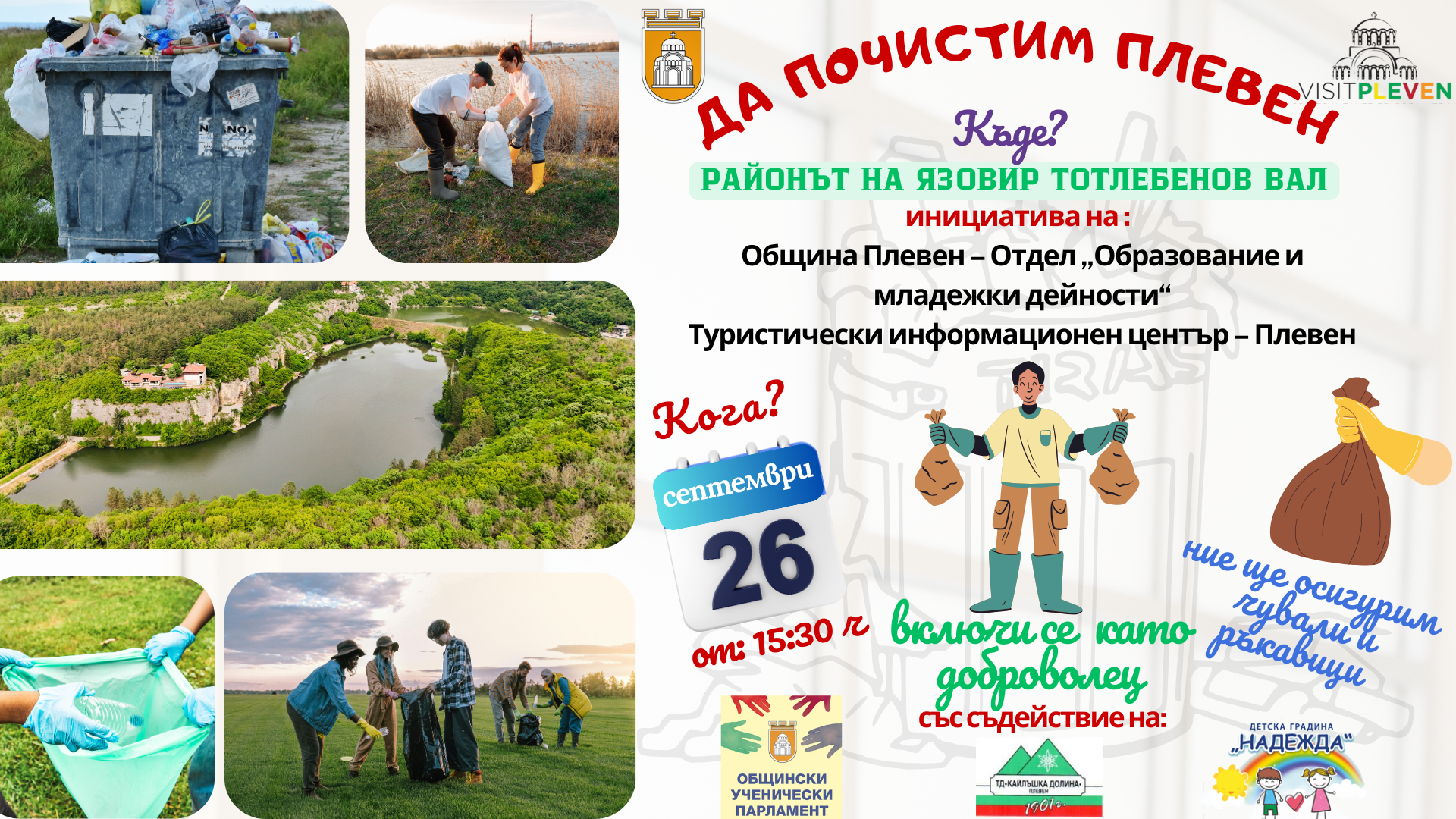 На 26 септември (петък) от 15:30 ч. край язовир „Тотлебенов вал“ ще се проведе доброволческа акция за почистване, организирана от Община Плевен, отдел „Образование и младежки дейности“ и Туристически информационен център – Плевен.